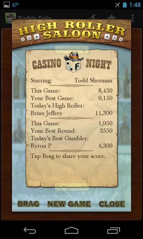Farkle Solo на High Roller Saloon захватывающий быстрый темп игры в кости. Набрать наибольшее количество очков в десять раундов, чтобы быть сегодня самым результативным игроком. Попробуйте побить ваш лучший результат или своих друзей. Готовы ли вы рискнуть всем, чтобы быть звездой салона?
