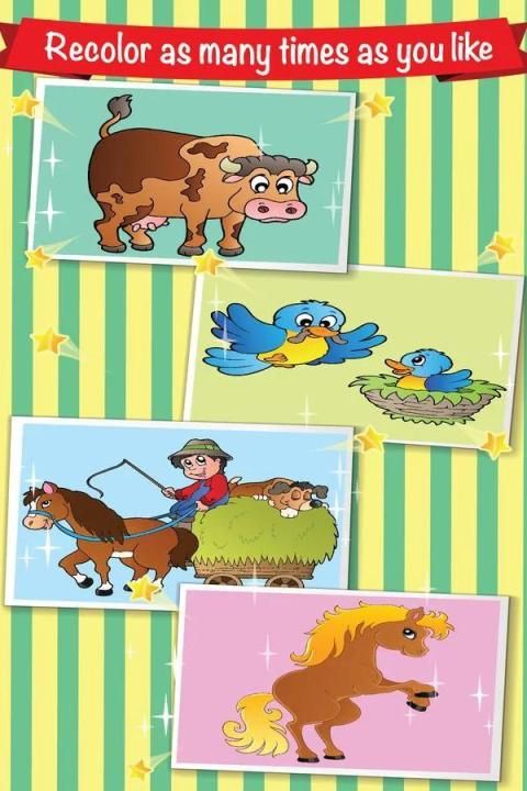 Colouring pages book for kids is a game full of farm game animal cute pretty and little pet like cows, pig, chicken and is not designed only for your 3-5 years old girls but your son as well. Color the coloring pages of horses and little ponies animal on your phone or tablet in this virtual painting book and coloring. It is so easy that even toddler can play. This free coloring game is a kids game where children can color and draw fun animal coloring pages, but they can also draw Farm coloring and their own drawing and painting. The game contains a lot of pictures of a little farm or great house village so it might be concerned as little animal cute pet coloring book as well. Both, boys and girls will love this coloring book game for kids. In this coloring game you can find some of fairy tale creatures such as cows, bird, pig, rabbit and more.