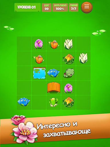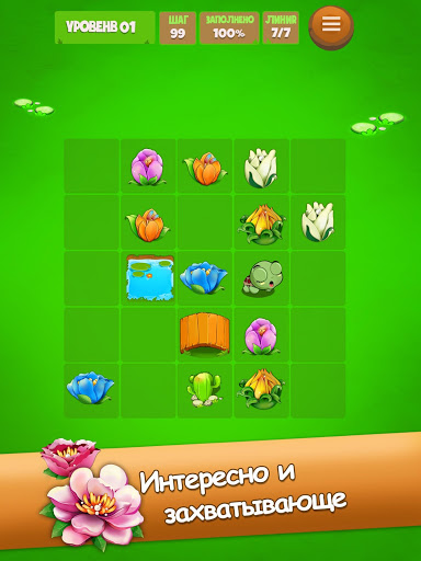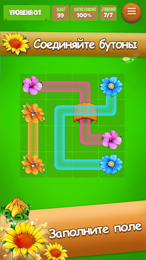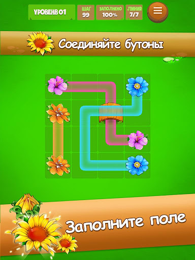 Соединяйте одинаковые бутоны, чтобы цветок распустился. Заполните всё поле, чтобы завершить уровень.