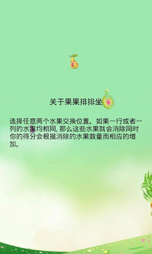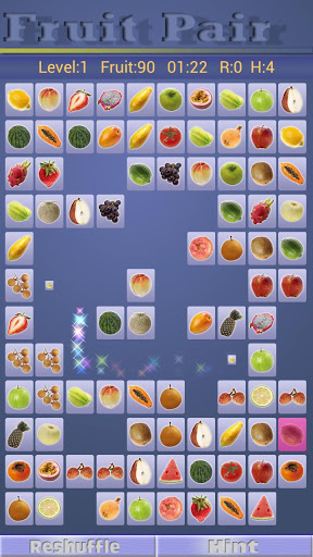 The purpose of the game is to remove all cards by pairing the same fruits There should be no obstacles between two pairing cards and the removing route must be less than two turns. Cards will be shuffled themselves if there are no more pairs. In addition, functions of Reshuffle and Hint are available for Easy and Medium level, but no for the Hard level.No skillNo time limitJust go and enjoy yourselfKeywords:Fruit, fruits, pair, pairs, connect, shuffle, hint, turn, cards, remove, route, pairing, reshuffle, obstacleResolution should be 800480 or higherSupport SAMSUMG S3, hTC ONE