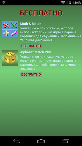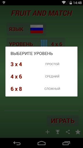 "Fruit and Match" это уникальное приложение, которое использует принцип игры в парные картинки для обучения и запоминания алфавита и иностранных слов на разных языках. Использование встроенной технологии перевода текста в речь позволит вам выучить не только буквы и слова но также усвоить как они произносятся на иностранном языке. Поддерживаются русский, английский, испанский, французский, немецкий, итальянский и португальский языки. Если вы хотите быстро выучить алфавиты иностранных языков или просто расслабиться, играя в парные картинки, то игра "Fruit and Match" это для вас!