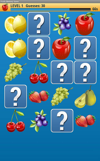 Fun and easy fruits memory game,improve your memory skills with fruits memoryFruits Memory Games One of the funnest memory game to play and free to download and enjoy quality game experience with the best fruits memory game with sharp icons of 3D fruit. Memory games are good practice for any age, The use of fruits in memory games are very popular as its very familiar pictures to ours brains memory. And thats what makes it more easy and fun to play with fruit in memory game. It39;sfantastic game where memory is the challenge using fruit symbols as a means of fun and excitement and training those highly valued cognitive skills that shapes the minds of today and tomorrow. Fruits that used in our memory game are : Green Apple, Red Apple, Orange, Grapes, Cherries, Blueberry, Strawberry, Pear, Banana, LemonFRUITS MEMORY GAME FEATURES:Excellent fruit graphics that are sharp and crisp so that the player will know which fruit symbol is which and not have to strain themselves.Fun sounds to carry you along playing Fruits memory game and limited to keep you on developingyour brains memory to remmember where the fruit symbols are and match them a pair. 3D Icons Touch Screen Sounds onoff options Vibrate onoff option Level difficulty based on time Automatic High ScoresWHY YOU SHOULD GET FRUITS MEMORY GAMEThis Fruit Memory Game is important for many reasons.The primary reason is because it is a memory improvement game where simple yet complex cognitive memory is tested.Both long and short term memory and other cognitive abilities are put to the test in a non invasive way.The simple symbols allow for the player to see them clearly and recall their configurations and see the results right then and there.This is the kind of testing and gaming that has value according to numerous studies showing that video games that are of a design and engineering where higher cognitive functions are challenged actually enhance the brain and the neurons.This is a benefit of all endeavors that are challenging but now with video games that effect has brought about new ways to produce games and more. This app is a branch off of the earlier video games that brought about such challenges and fun that people would get addicted.Now these games can be translated into apps like this memory game.Now here39;s something that you just can39;t get away from.The fun of these games are such that they quickly become the primary form of entertainment for app users and that can be good.This app isn39;t some mindless game where you run around shooting people, this is a game for kids and adults who are young at heart.Kids can play this game at home or on those long road trips.They39;ll get a kick out of trying to solve this fruity fun and teachers can use it to see how the child39;s cognitive development grows.Parents don39;t have to worry about any violence in this app.It39;s just the kind of family natured fun designed for kids that doesn39;t have offensive sounds, sights or anything.With today39;s parenting computing technology you might even want to record some of your child39;s game play so you can see how fast your child adapts.These recordings are of great value especially if you take pride and concern in your child39;s cognitive development.If you39;re not that serious then you can watch as the kids play this game and have all kinds of fun.While they39;re playing it you can bet they won39;t be getting into any trouble either.So all in all you have a simple game that using advanced but user friendly game play strategies that test the cogni