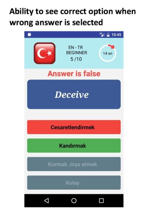 Во всех уровнях, даже если вы отвечаете на вопросы неправильно, вы можете улучшить свой английский словарный запас, узнавая правильный ответ слова. Вы можете также решить новые тесты без необходимости подключения к Интернету, повысить свои результаты и высокий рейтинг в списке лидеров.