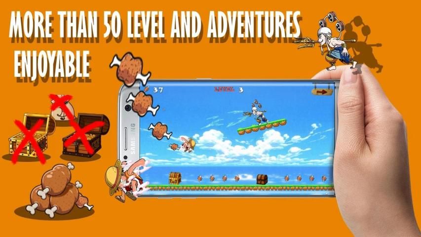 Луффи начинает работать, и вы должны перепрыгнуть через все препятствия, прежде чем нажать на экране