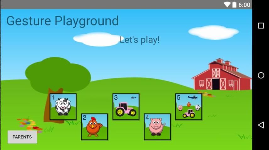 Жест площадка представляет собой приложение, чтобы научить детей младшего возраста некоторые жесты, необходимые на устройствах Android. Во время игры с помощью жестов, Жест площадка также усилит цвета, цифры и звуки автомобиля. Малыши учатся лучше всего играть и делать действия. Каждый уровень имеет короткий учебное видео. Тогда малыш будет практиковать / играть с этим жестом на уровне.