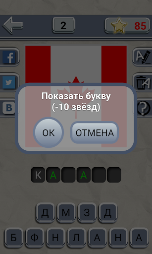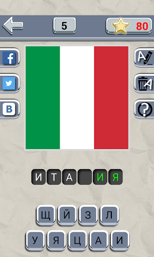 Суть игры состоит в том, чтобы отгадать предлагаемый флаг страны. В пустую ячейку перетяните выбранную букву, в случае ошибки - просто нажмите на нее. Возьмите подсказку: показать одну букву или убрать все неправильные. Играя в игру каждый день, вы получаете дополнительные звезды, которые впоследствии можете использовать в качестве подсказки. Отгадывайте, познавайте и делитесь ссылкой в любимых соц.сетях.