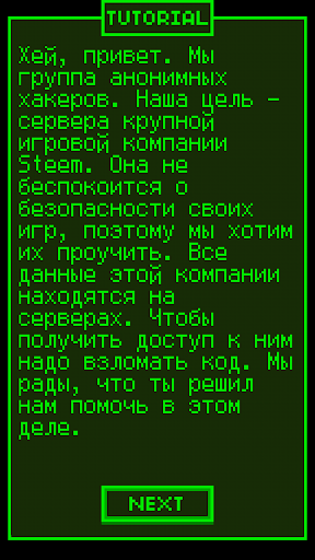 Хей, всегда мечтал стать хакером? А представь, что у тебя появилась возможность помочь группе анонимных хакеров взломать сервера крупной компании Steem*! Звучит заманчиво? Тогда качай игру и становись хакером!