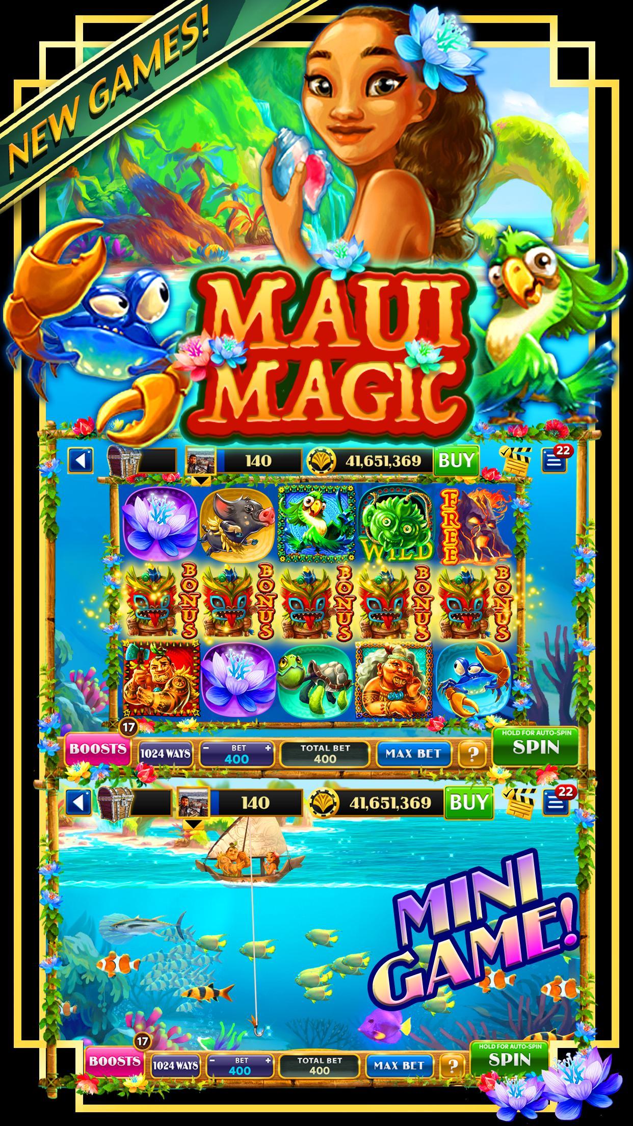 - New Slot Machine! - MAUI MAGIC! Join Leilani and friends in paradise. Explore the island for bountiful rewards. Grab the BIG catch in the FISHING BONUS. Thank Pele the Volcano God for LOCKED FREE SPIN WILDS! Play now!