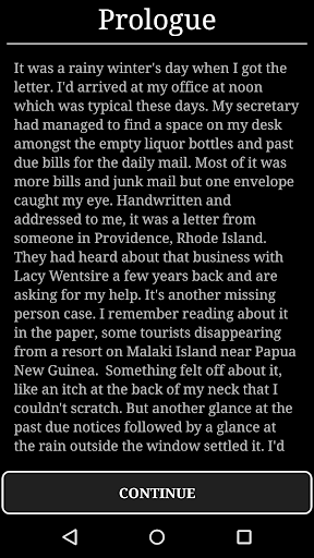 Horror in the Pacific is an exploration adventure game inspired by the works of H.P. Lovecraft, where players explore and investigate a large open world map, progressing though an engaging and exciting story. It is a mobile phone adaption of the classic text-based adventure genre, similar to the point-and-click classics. The game combines a bleak environment, an sense of underlying dread, and several moments of comedy to keep you entertained.