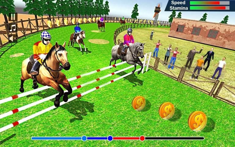 вы готовы участвовать в верховой езде? если вы готовы, тогда добро пожаловать в гонку за доминирование с высокой захватывающей игрой на лошадях и привлекательной средой. будете ли вы способны кататься на лошади, чтобы увернуться и перепрыгнуть через препятствия на лошадях в гоночных 2018? покажите свой опыт верховой езды и преследуйте своего оппонента, чтобы пересечь финишную черту в играх на верховой езде. мы дадим вам несколько уровней; где вы должны начать практиковать до начала чемпионата в скачках. катайтесь на лошадях дерби в свободном режиме, чтобы создать свою лошадь навыков верховой езды и проверить контроль лошади и другие препятствия, которые мы предоставим вам верхом на лошади. мы дадим вам несколько захватывающих и авантюрных миссий на скачках. вы будете заниматься верховой ездой, а затем участвовать в чемпионате лошадей на верховой лошади. имейте в виду сбалансировать скорость и выносливость в игре на лошадях. если ваши лошади бегут с высокой скоростью, то выносливость будет использоваться быстро, поэтому проверьте все вещи и уклонитесь от своего оппонента ловко и прыгайте в нужное время, чтобы избежать препятствий в скачках 2018 года.
