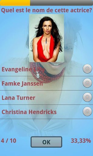 Maybe you know Angelina Jolie, Marilyn Monroe or Nicole Kidman. But do you also recognize sexy actresses like Alexis Bledel or Amy Adams? With this quiz you can test your knowledge of hot female moviestars. It provides youwith random female actresses and you have to recognize them within a few seconds.. fun to play against your friends.Check it outThis version contains the following moviestars:Aishwarya RaiAli LarterAlicia SilverstoneAmber HeardAngelina JolieAnna KarinaAudrey TautouAva GardnerBrigitte BardotCameron DiazCate BlanchettCatherine DeneuveCatherine Zeta JonesCharlize TheronCharlotte RamplingCherChristina HendricksClaudette ColbertClaudia CardinaleDaryl HannahDemi MooreDenise RichardsDiane KrugerDianne AgronElizabeth HurleyElizabeth TaylorEmmanuelle BeartEva GreenEva LongoriaEva MendesEvangeline LillyFamke JanssenFanny ArdantFarah FawcettFaye DunawayGina LollobrigidaGoldie HawnGong LiGrace KellyHalle Berry1Hayden PanettiereHedy LamarrIngrid BergmanJacqueline BissetJane RussellJanuary JonesJayne MansfieldJean HarlowJennifer AnistonJessica AlbaJessica BielJessica LangeKate BechinsaleKate HudsonKatie HolmesKim BasingerLana TurnerLaura VandervoortLauren BacallLiv TylerLucy LiuMadonnaMaggie Q.Marilyn MonroeMarlene DietrichMary Elizabeth WinsteadMegan FoxMichelle PfeifferMichelle RodriguezMichle MercierMila KunisMilla JovovichMonica BellucciMonica VittiMoon BloodgoodNastassja KinskiNatalie PortmanNatalie WoodNatasha HenstridgeOdette YustmanOlga KurylenkoOlivia WildePamela AndersonPenelopecruzRachel WeiszRaquel WelchRita HayworthRomy SchneiderCheck it outI39;m open to suggestions so don39;t hesitate to send me an email if you find something is missing.This application is supported 20 languages as follows.Chinese, Czech, Danish, Dutch, English, Finnish, French, German, Hungarian, Italian, Japanese, Korean,Norwegian, Polish, Portugues, Romanian, Russian, Spanish, Swedish.Some newer parts are only in English. If you can translate them to your language, please email us. Thank you.