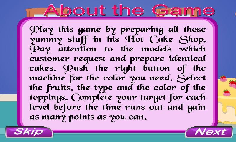 Play this game by preparing all those yummy stuff in his Hot Cake Shop. Pay attention to the models which customer request and prepare identical cakes. Push the right button of the machine for the color you need. Select the fruits, the type and the color of the toppings. Complete your target for each level before the time runs out and gain as many points as you can.