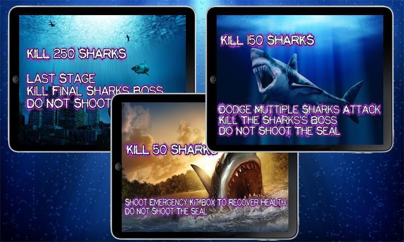 Вы как человеческая охота на акул и отомстить за жертв нападению акул. Убить как можно больше акул, как вы можете выполнить миссию. Есть несколько этапов, которые необходимо завершить. Вы должны стрелять определенное количество акул прежде, чем идти на следующие этапы. Настоящее заставка является печать, которая падает ценный аварийный комплект. Стреляй аварийный комплект для восстановления повреждений. Но не убивайте печать, стрельба уплотнение означает, что ваш уровень здоровья не может быть, как восстановить ваш бар здоровья может быть только восстановление с аварийным комплектом коробки упал печатью. Опыт красивый океан и коралловый риф фон в то время как вы играете в игру.