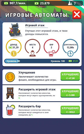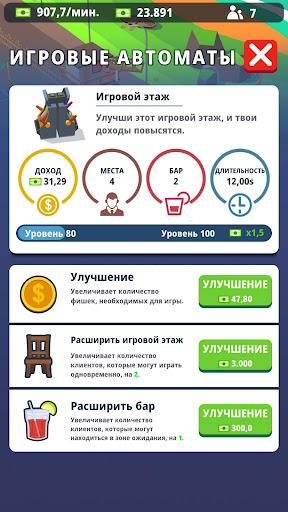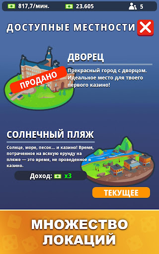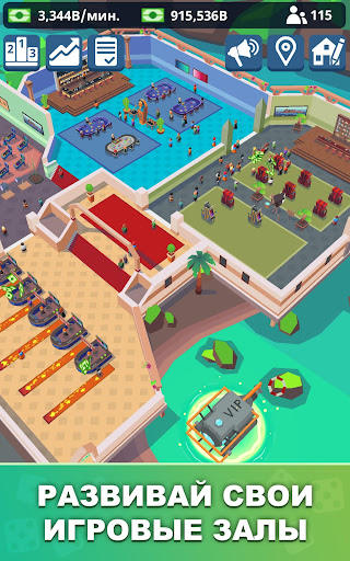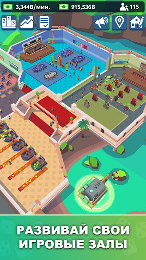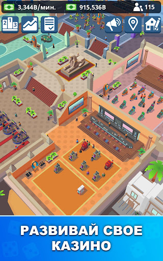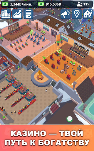 Повышай привлекательность своего казино, устанавливая новые покерные столы, рулетку с золотым шаром или новые аркадные автоматы. Расширяй парковку и запускай рекламные кампании, чтобы привлекать еще больше посетителей в свое казино.