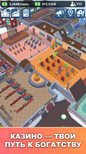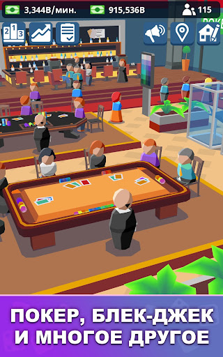 Мудро управляй баром и кассами, чтобы получить максимум прибыли. Расширяй казино, добавляя новые этажи и разблокируя новые увлекательные игры и автоматы.