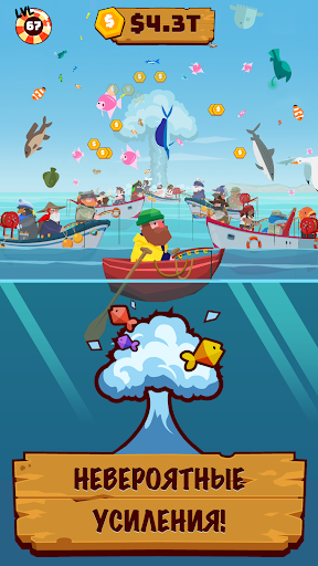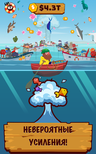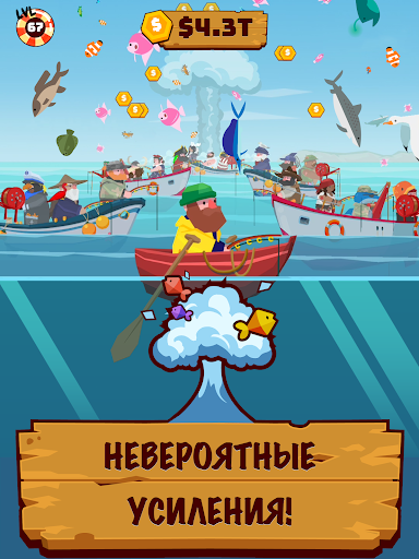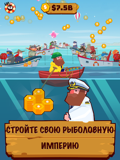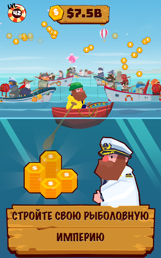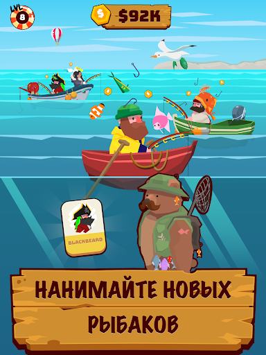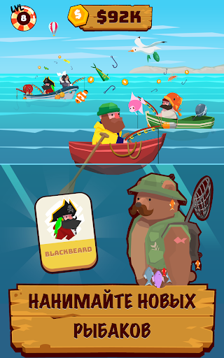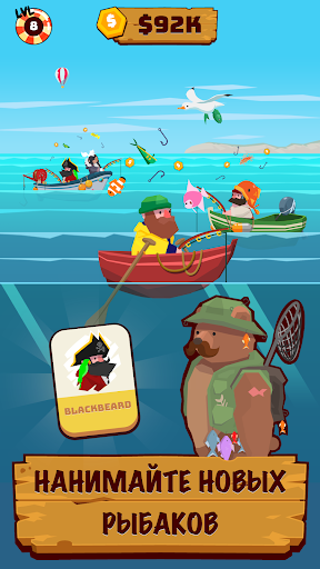 - Разблокируйте новых рыбаков, что продолжат зарабатывать вам деньги, пока вас не будет!