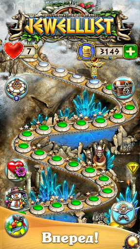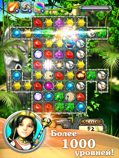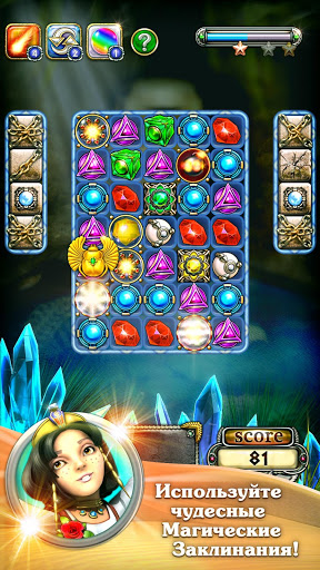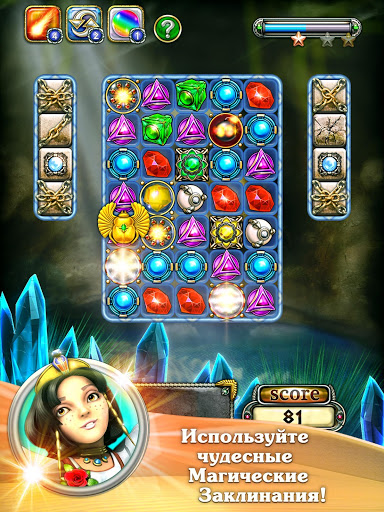 - Собирайте кристаллы по три в ряд и создавайте новые мощные бонусы на поле из фигур по 4 или 5 самоцветов