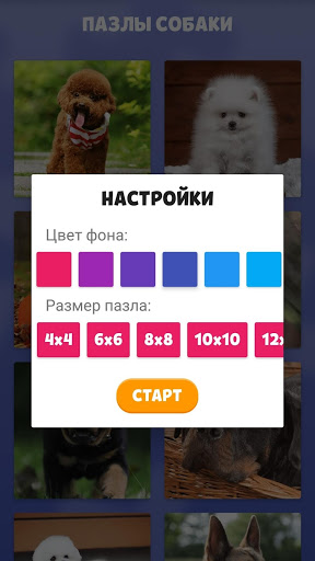 Игра для детей и взрослых "Пазлы Собаки" позволяет настраивать размеры мозаики. Есть размер 2х2, 4х4, 6х6, 8х8, 10х10, 12х12. Можно менять фон для усложнения игры.