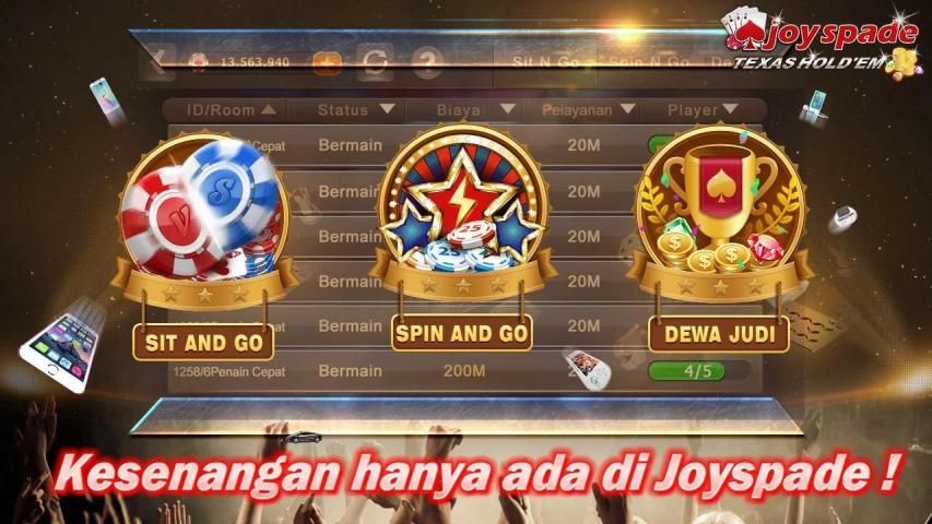 Joyspade: Техасский Холдем покер из самых популярных в Индонезии. Бесплатно скачать и сразу же получить 50 миллионов фишек! Различные типы игр и турниров, таких как Round Robin, спина N Go и более. Играя в Техасский Холдем вместе с миллионами игроков, только Joyspade наиболее подходящий выбор!