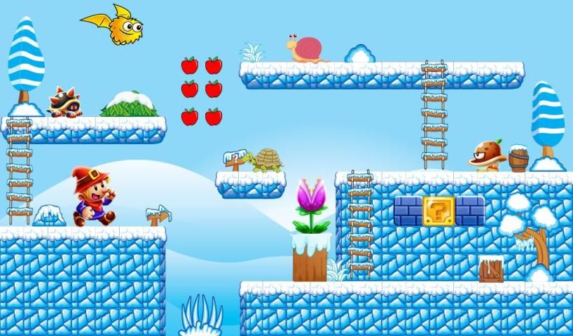 Мальчик бежит и прыгает на разных платформах и на вершине врагов в тематических уровнях. Джунгли Boy Приключения имеют простые сюжеты, как правило, с мальчиком спасая похищенную принцессу из первичного антагониста.