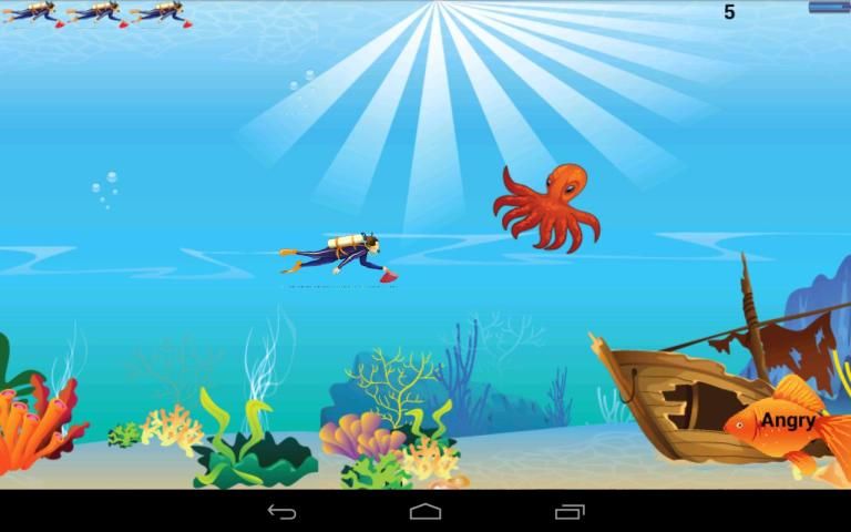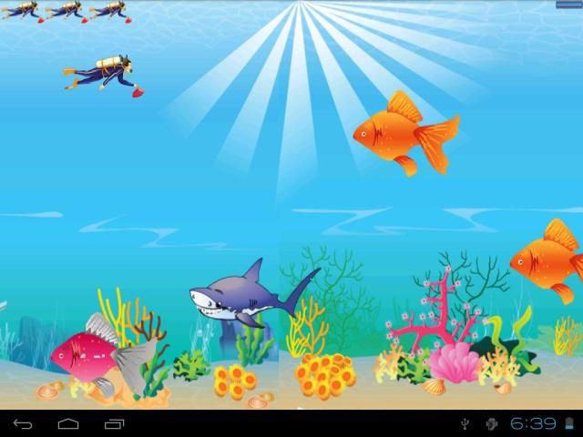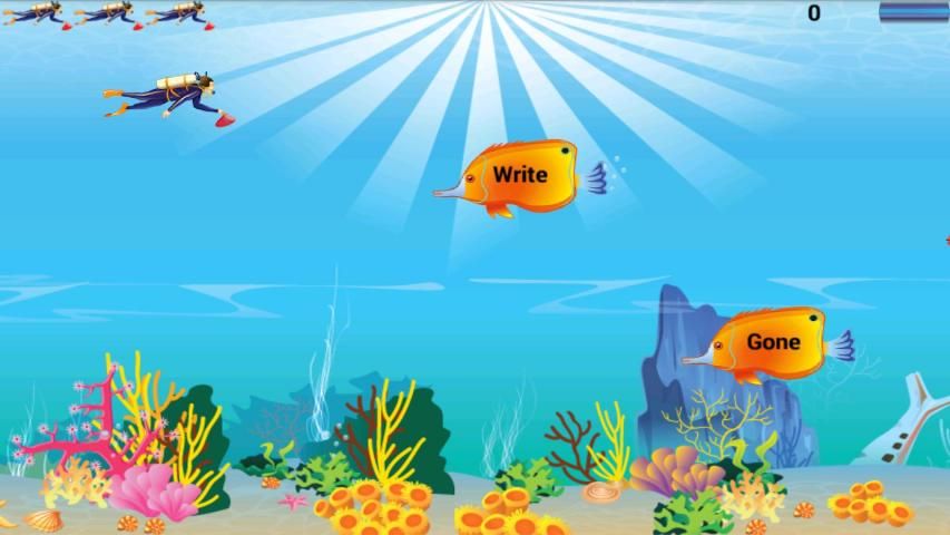 Начиная экране приложения имеет четыре кнопки: Новая игра, Возобновить игру, десятки и Выйти. Нежное прикосновение на кнопке Новая игра открывает страницу Уровни. По умолчанию установлен уровень 1 уровень, а уровень 2 и 3 будут заблокированы. Один может прогрессировать вперед только после успешного завершения каждого уровня. В любой момент игры, он может быть сохранен и доступны позже с помощью кнопок Возобновить игру. Кнопка результаты для просмотра списка лучших результатов. Основная игра Игра предполагает дайвера, который пользователь должен коснуться и перетащить в направлении встречного рыб того существительное имена на уровне 1, имена местоимение в именах уровня 2 и глагол в уровне 3. устричных раковин являются жизненно в этой бесплатной игре английской грамматики и должны быть собраны. Тем не менее, игра может закончиться, если дайвер затягивать к встречного акулы или осьминога.