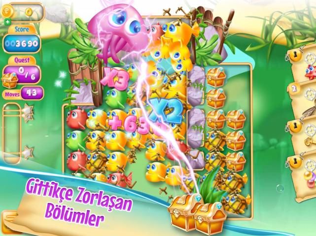 Говоря о гладкой и легко узнать геймплей, поп рыбы нужно просто найти 2 или более одинаковых цветных рыб и нажмите на любой из них. Чем больше рыб вы взрывы в то же время, тем больше баллов вы получите. Существуют различные цели и задачи, на разных уровнях, в том числе установки определенного процента рыб бесплатно или собирать определенное количество сундуков. Вы не можете достигнуть следующего уровня, если вы не завершите текущий. У вас есть ограниченное количество ходов, так что вы должны следовать различным стратегиям, чтобы иметь возможность выскочить рыба и достичь целей уровня перед запуском из ходов. Существуют различные бонусы и ускорители для использования во уровней, которые могут возникнуть так удобно. Доступные бустеры: Star Fish, ножницы, Золотой ключ, и цвет Perl. Эти ускорители получить разблокировать, как вы прогресс в игре, и вы всегда можете пополнить их с помощью собранных монет. Монеты могут быть собраны в определенных уровнях или будут вознаграждены к вам в качестве подарка.