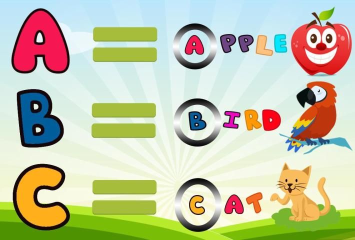 например (А это может быть яблоко, и B это может быть птица, и C это может быть кошка, .....) и Таким образом, ваш ребенок узнает, как произношение легкий и простой способ, с очень хорошей песней,