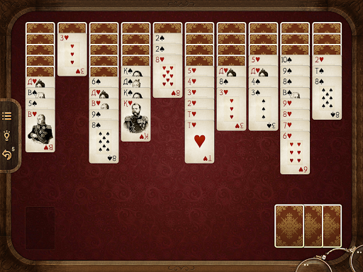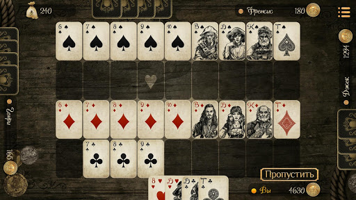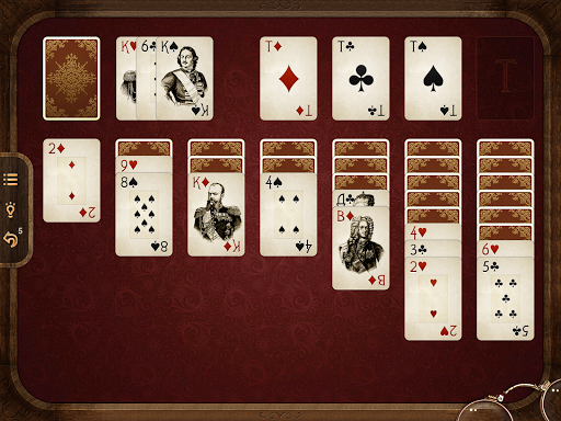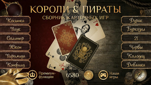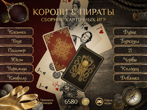 → Пасьянсы - Косынка, Паук, Солитер, Пирамида, Кэнфилд и Юкон - выдержаны в стилистике Российской империи XVIII-XIX веков. На карты нанесены портреты императоров (королей) и императриц, а также фельдмаршалов. Карточные игры - Дурак, Червы, Буркозел, Червы, Девятка, "21", Колодец - нарисованы в современной "морской" тематике: на картах портреты пиратов, а игра ведется на столе из грубых досок.