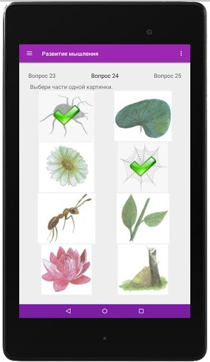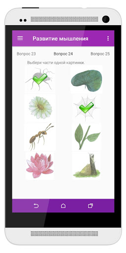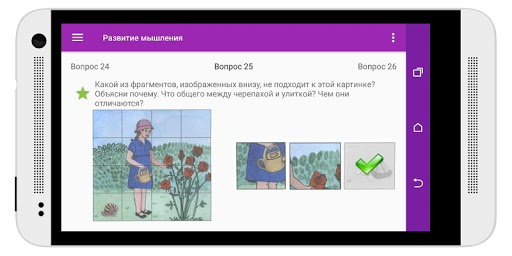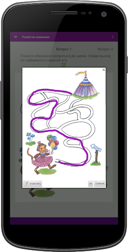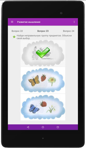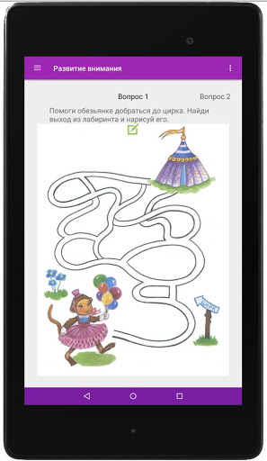 через игру приносит не только пользу, но и удовольствие. Приложение предусматривает занятие именно взрослого с ребенком. Для этого необходимо прочесть ребенку задание и дать самостоятельно решить поставленную задачу. Некоторые из тестов не интерактивны, они предполагают устный ответ ребенка на заданный вопрос, т.е. развивают его речь. Большая часть вопросов интерактивна, в них ребенку необходимо выбрать правильный вариант или варианты. Некоторые задания в игре предполагают выбор пар правильных ответов, чаще всего это задачи развивающие логику ребенка. Также есть вопросы, в которых ребенок должен "нарисовать" правильный ответ, к примеру, найти выход из лабиринта,