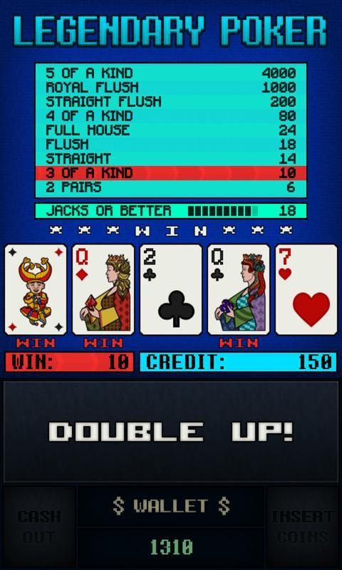 Это лучший видео покер машина когда-либо. Видео Покер, как American Poker с Джокером, Валеты или лучше бонуса и удвоить - 8 раз. Каждый игрок получает кошелек с 200 монет приветствия награды и ежедневной награды, которая изменяется от 40 до 90 монет. Ставки могут быть изменены от 2 до 10000 монет. Несколько статистические данные, а также, что они включают в себя: Победа статистики, Double Up статистика и статистика кошелек.