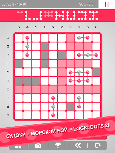 Если вам нравится решать оригинальные головоломки, вам нужна игра Logic Dots 2! Это - очень легкая и увлекательная игра: располагайте точки в ячейках, чтобы составлять фигуры и решать головоломки. Эта уникальная, невероятная комбинация судоку и морского боя отличается простотой и логичностью, но постепенно становится все сложнее. Игра Logic Dots 2 удивит и порадует вас в равной степени.