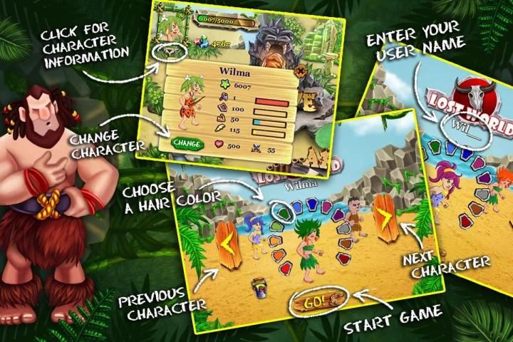 Когда вы начинаете игру «Затерянный мир» Вы можете выбрать один из 10 символов - они имеют разный набор качеств - силы, силы, энергии и т.д. Сделайте свой уникальный характер - изменить цвет волос, выбрать имя и нажать "старт кнопка "! Во время игры вы можете развить характер, повысить его боевые качества, купить ему оборудование и различные амулеты, которые помогают бороться со всеми мощными и опасными врагами!