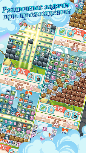 Вам нужно изображения животных собирать по три в ряд, чтобы проходить уровни. собирая несколько рядов за раз вы набирает больше очков. Попробуйте собирать комбинации сразу в 3 ряда чтобы зарабатывать максимальное количество очков или собирайте в ряд по три как можно быстрее создавая при этом комбо!