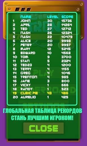 Дольше играете – круче становитесь! Получайте новые уровни, чтобы увеличивать множитель очков и впишите своё имя в глобальную таблицу рекордов!