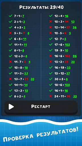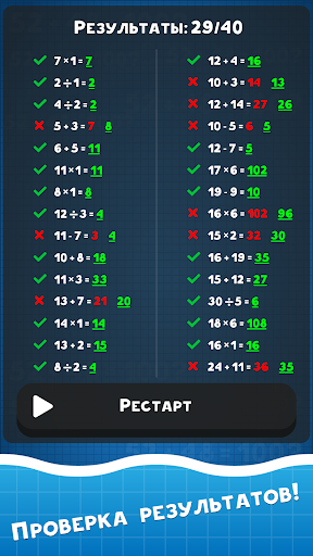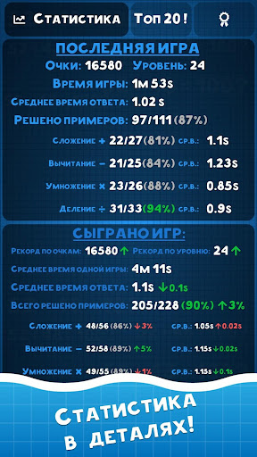 В этой математической игре тебе придется показать все свои знания по математике и таблице умножения, чтобы решить арифметические примеры на сложение, вычитание, умножение и деление. Любая математическая игра на счет тренирует арифметические навыки. Но когда время на решение примера ограничено, этот навык развивается на более высоком уровне. Чем больше математических примеров ты решаешь, тем сложнее примеры и тем быстрее утекает время на размышление. В конце каждой игры ты увидишь подробную статистику твоих математических навыков.