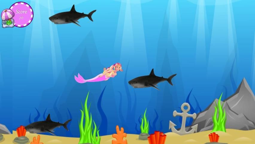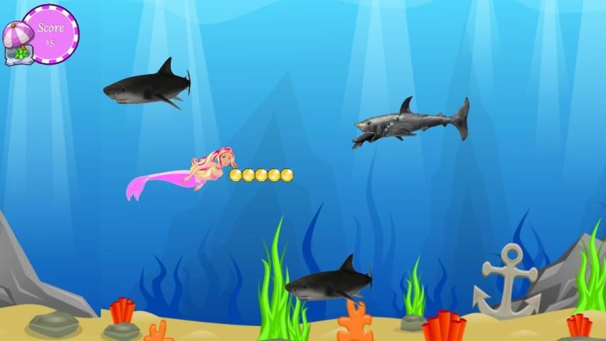 Симпатичный и прекрасный русалка сбегает нападения акул. Пожалуйста, помогите красивой русалки. Постарайтесь, чтобы избежать нападения акул и собрать все подарки с русалкой Barbie. Будьте осторожна, скорость игры увеличить каждые секунды.