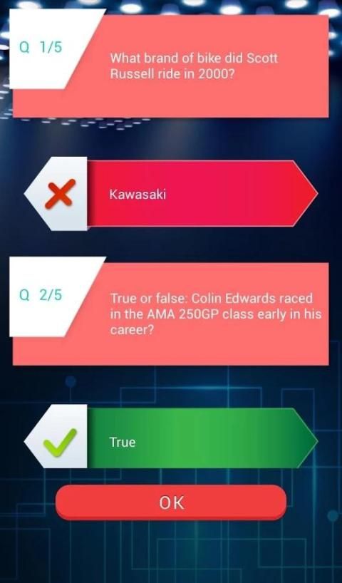 Это тест забавная игра, где вы отвечаете на вопросы, связанные с гоночной викторины мотоциклов.