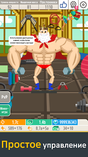 • Нажмите в любом месте и в любое время. Эта простаивающая игра позволяет собирать энергию, чтобы поднять мышцы, даже когда вы не играете.
