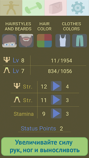 - С новым уровнем немного увеличиваются мышцы и вы получите очки статусов для увеличения силы рук, ног и выносливости в меню персонажа.
