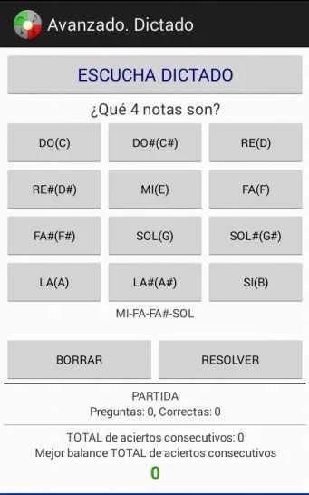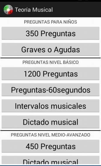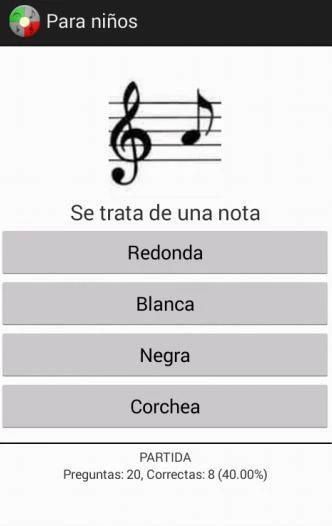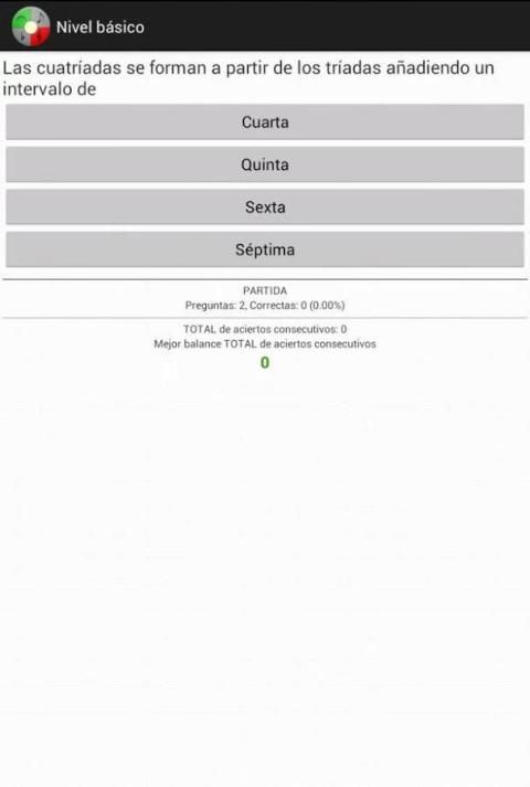 1300 Вопросы по базовом уровне, предназначена для детей, начинающих и в музыке (хотя и содержит вопросы для всех уровней). Вопросы уровне в 60 секунд вас есть одна минута, чтобы решить вопросы, поднятые. Игра, чтобы попытаться решить 10 вопросов в каждой игре, которую играет. Успехи и проценты рассчитывают по пункту. Нынешний рекорд последовательных успехов и лучшей записью последовательных успехов без ошибок в общей сложности элементов сохраняется также. Вы можете отправить результаты ваших игр для ваших контактов по электронной почте или WhatsApp.