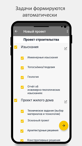 • Создание проекта в несколько кликов. В большинстве случаев достаточно уточнить, строительство или ремонт вы собираетесь делать. Задания сразу будут отсортированы по этапам в правильной последовательности. Постройте дом своей мечты или сделайте ремонт квартиры без ошибок и переплат!