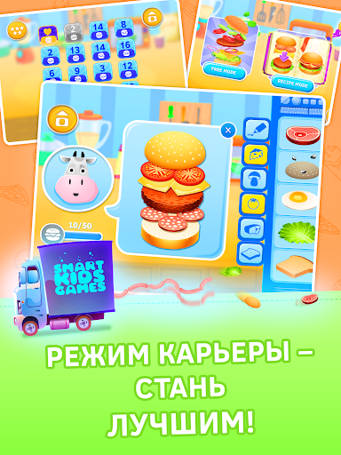 • Два режима игры про готовку еды: Свободный режим и Кулинарный марафон. Ты можешь готовить все, что хочешь или можешь принять вызов, чтобы пройти путь от продавца в простой закусочной до шеф-повара известного ресторана;