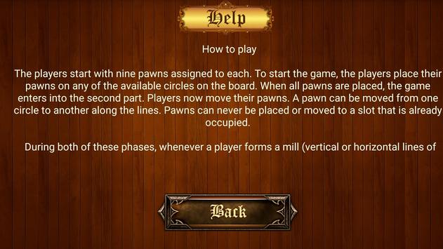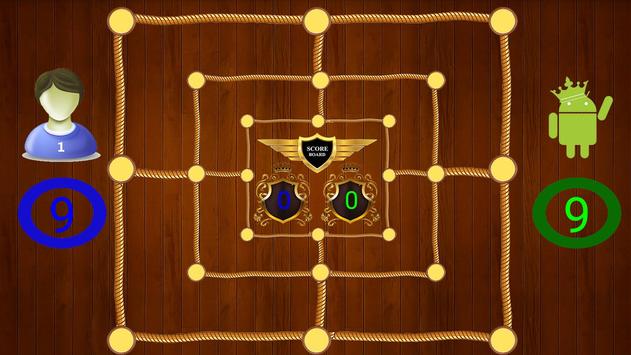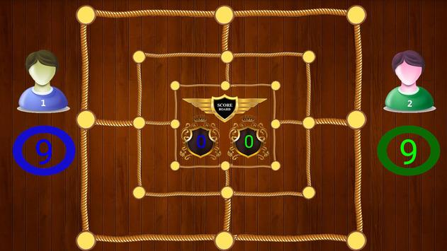 The players start with nine pawns assigned to each. To start the game, the players place their pawns on any of the available circles on the board. When all pawns are placed, the game enters into the second part. Players now move their pawns. A pawn can be moved from one circle to another along the lines. Pawns can never be placed or moved to a slot that is already occupied.