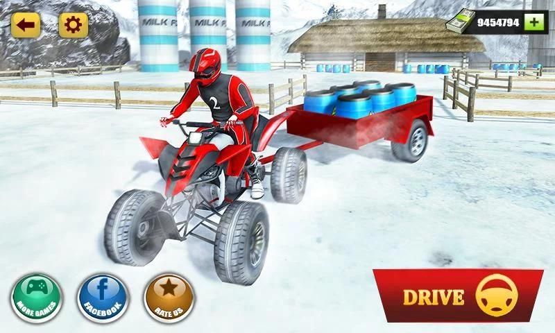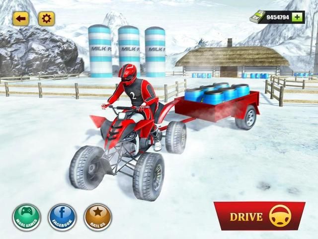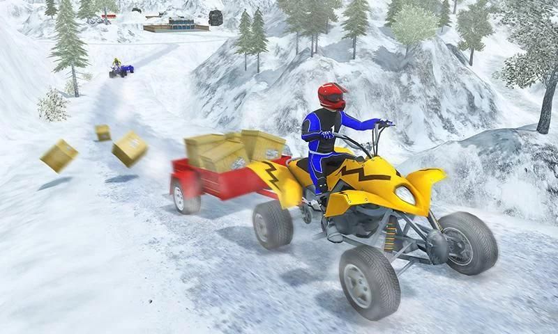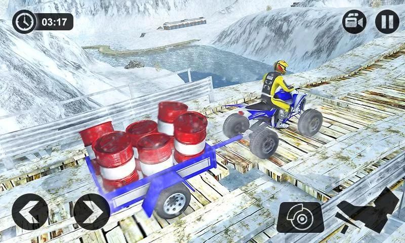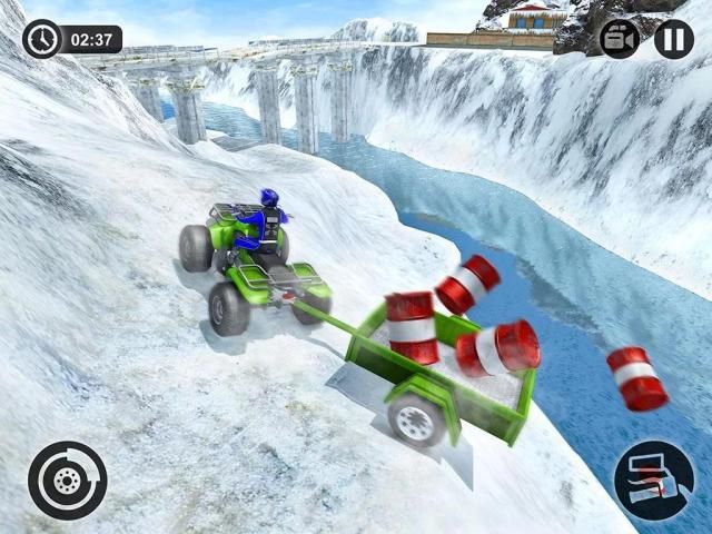 Зимний сезон пришел и горные склоны покрыты снегом из-за которых перевозку грузов становится трудно. Пора ехать один из лучших квадроцикл симулятора 3D игр. Познай 4 колеса велосипеда от внедорожных треков доставить груз в качестве тележки транспортера. Люди на холме станции нуждается ATV помощи, чтобы получить некоторые продукты и товары. Вы должны доставить эти пункты груза езды 4x4 ATV велосипеда на лед дорогах, которые неровные и трудно ездить. Это квадроцикл моделирование требует каскадера наездника, который может делать экстремальные трюки без аварии мотоцикла во время восхождения на холмы. осторожно с 4 Уилер Drive во время четырехъядерных трюков, потому что если вы падаете от высокой снежной гор вашего груза прицеп будет уничтожен. Авантюрная поездка для любителей транспорта, которые могут ездить мусорную 4 велосипеда для достижения альпинистских миссий холма.