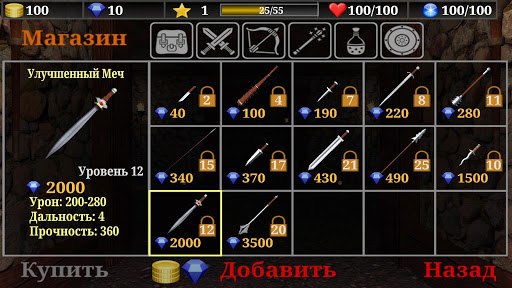 - вы начинаете играть с одним из следующих видов оружия: 1 сломанный меч, 2 могильные камни, 3 мерцающий кинжал, 4 метательные ножи убийцы, 5 меч рыцаря, 6 лук охотника подземелий, 7 булава мстителя, 8 волшебный посох еретика или 9 копье войны