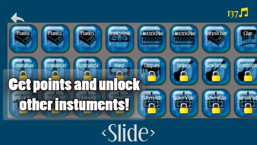 You are able to unlock hundreds of instruments i.e. electric piano, classic piano, acoustic guitar, electric guitar, jazz guitar or bass guitar.