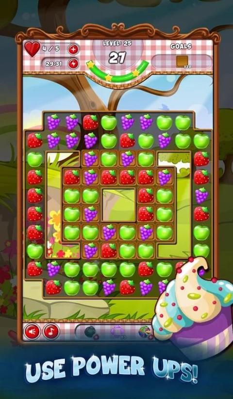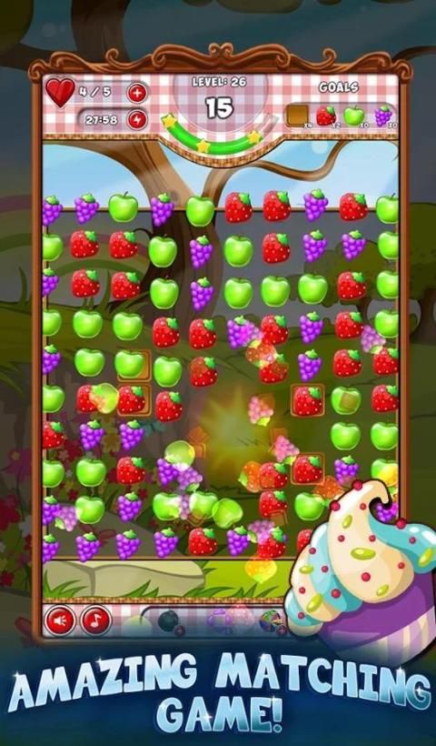 Совпадение яблоки, бананы, вишни, апельсины и многое другое, пока вы работаете свой путь через сладкие фрукты заполнены уровнях.