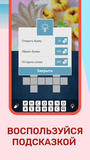 С подсказками играть проще: если возникнут трудности, воспользуйся ими. А еще можно попросить помощи у друзей. Хочешь сразу перейти к новому уровню? Используй заработанные монеты!