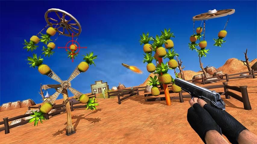 Будьте острый стрелок, чтобы прицелиться и стрелять сосновые яблоки на головах бутылки, стрелять ананас ПОЛУЧИТЬ сосны яблочного сока, как кнопки желе сосны яблока!