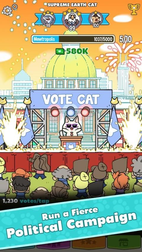 Create your cute, cuddly candidate, and realize your dreams of world domination by assembling a team of tiny humans to manage your campaign and get you elected. You’ll start out as Class President and work your way up to become Supreme Earth Cat, earning endorsements from Celebrity Cats along the way! Watch as supporters flock to hear what you have to say, offering up their hard earned cash to fund your global campaign.